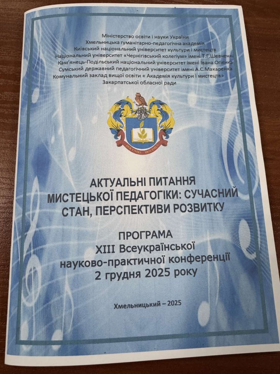 2 грудня 2025 року в Хмельницькій гуманітарно-педагогічній академії відбулася ХІІІ Всеукраїнська науково-практична конференція «Актуальні питання мистецької педагогіки: сучасний стан, перспективи розвитку». Захід проходив у складних умовах воєнного часу, однак попри це згуртував значну кількість науковців, викладачів та педагогів- практиків із різних регіонів України.