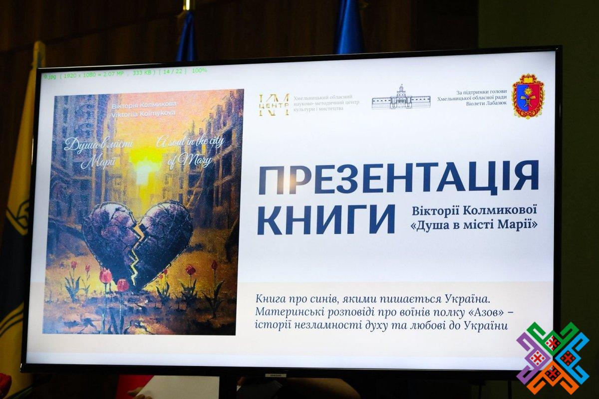 Сьогодні за підтримки Хмельницької обласної ради у приміщенні Хмельницького обласного науково-методичного центру культури і мистецтва відбулася презентація книги «Душа в місті Марії» авторства Вікторії Колмикової – матері Героя, оборонця Маріуполя.