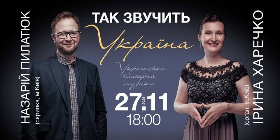 Унікальна програма для скрипки та органа відкриє багатогранний світ української камерної музики. Її втілять майстри сцени: народний артист України Назарій Пилатюк і заслужена артистка України Ірина Харечко, музиканти, чия гра перетворює звук на емоцію, а концерт – на подію.