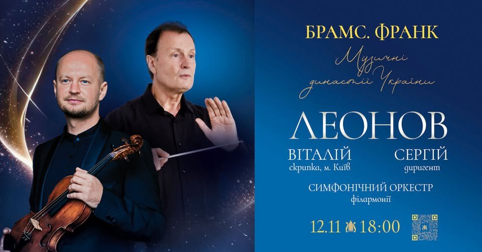 Цього вечора на сцені – музична родина Леонових: маестро Сергій Леонов та його син, скрипаль Віталій Леонов. У програмі – Концерт для скрипки та оркестру Брамса і Симфонія ре мінор Франка, що прозвучать у виконанні нашого оркестру, даруючи глибину, велич і щемливу красу.