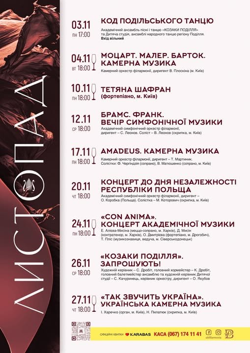 Листопад у Хмельницькій філармонії – це мозаїка подій, де народне мистецтво, класика і сучасність звучатимуть у єдиному ритмі. Від танцювальної феєрії до камерних вечорів, від Моцарта і Малера до українських композиторів – кожен концерт подарує емоції, глибину і живе спілкування з музикою.