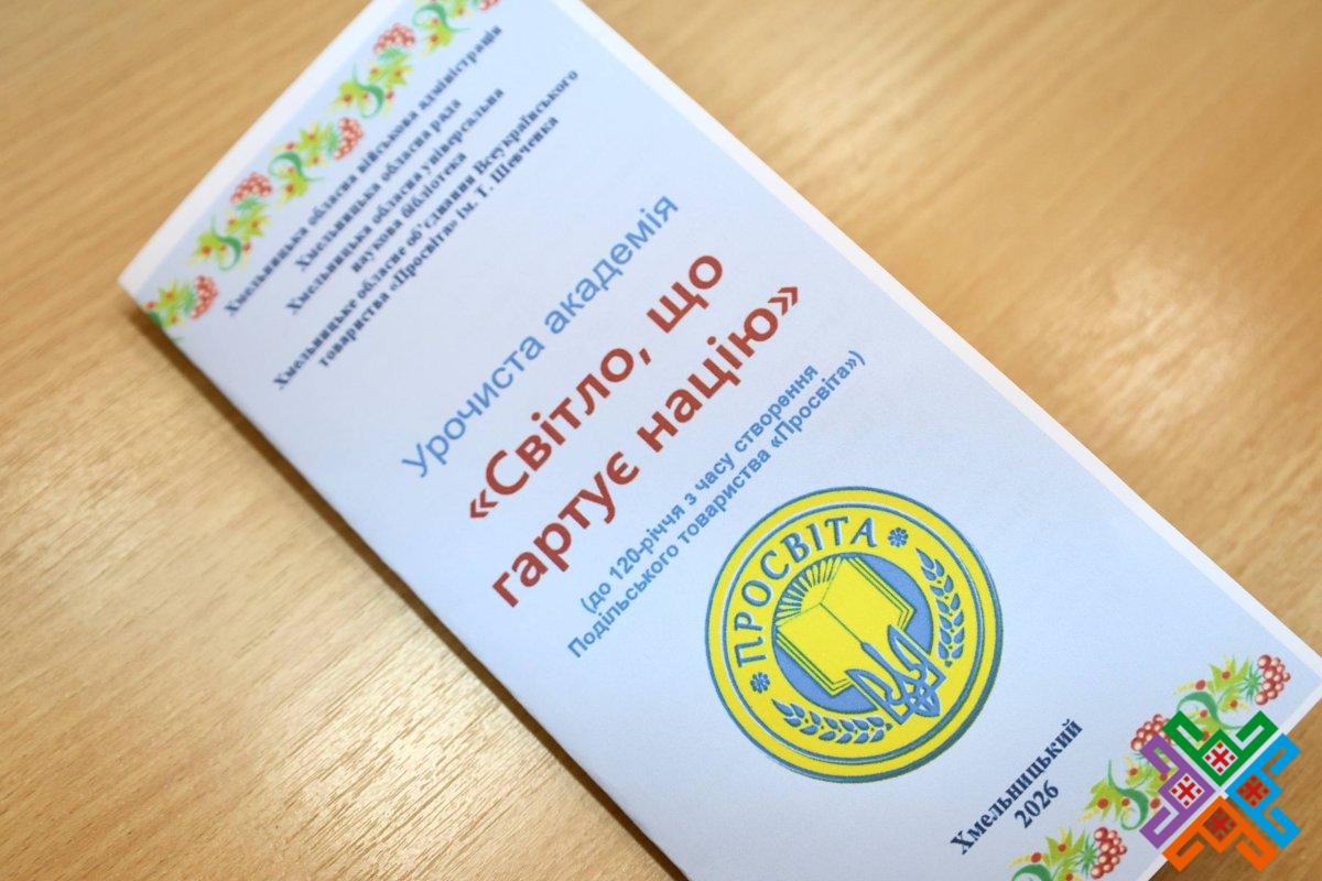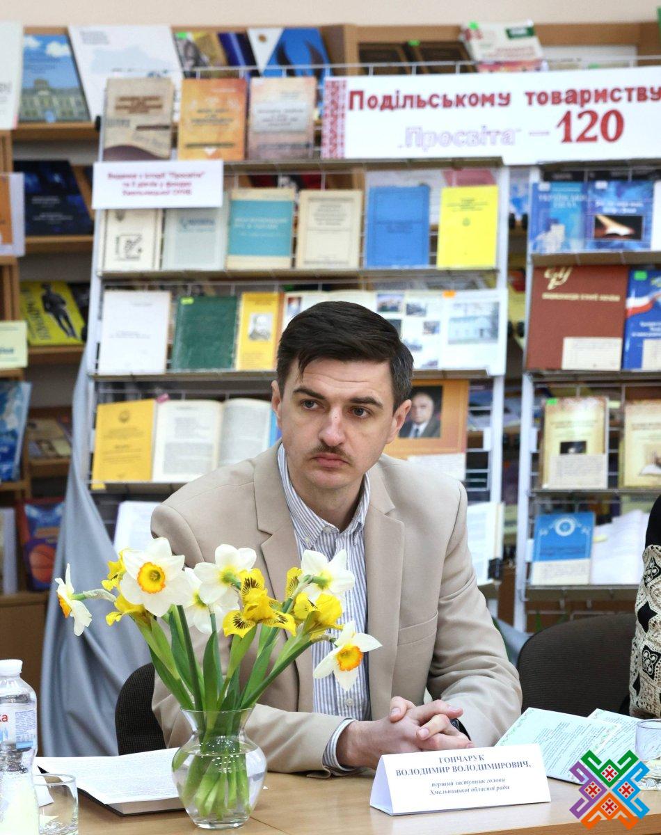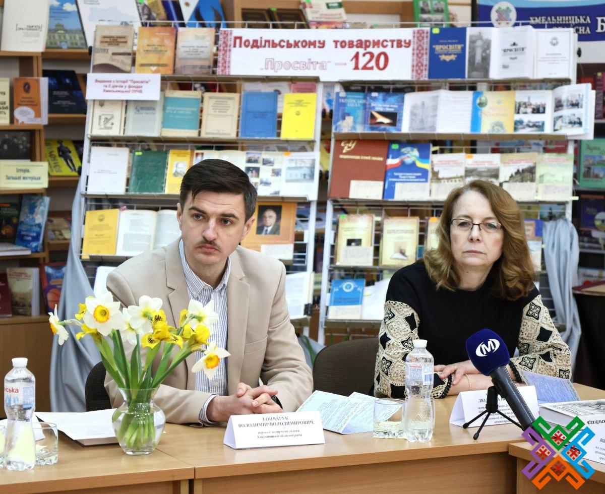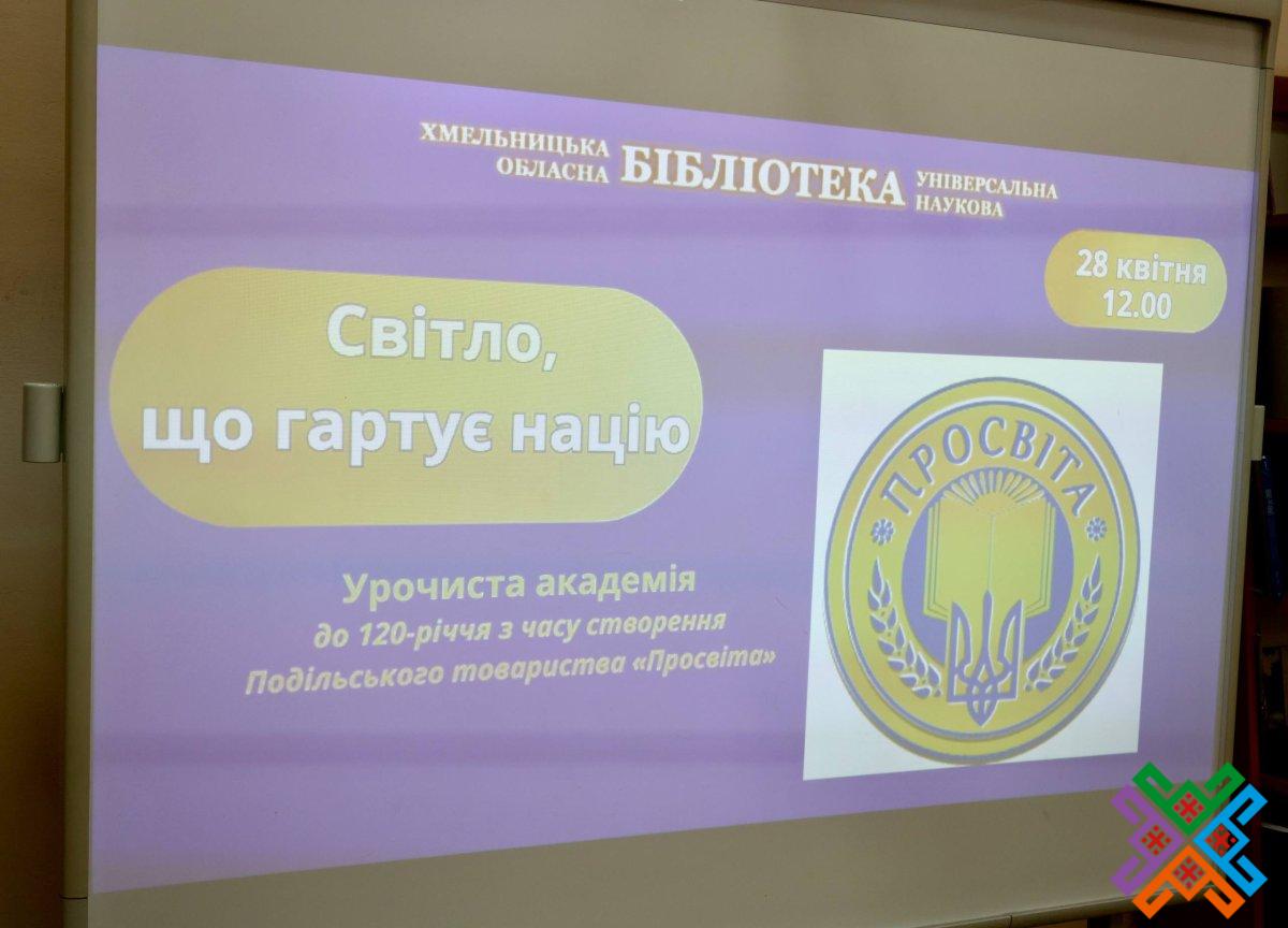 Сьогодні в обласній універсальній науковій бібліотеці відбулася урочиста академія з нагоди 120-річчя створення Подільського товариства “Просвіта”. У зібранні взяли участь перший заступник голови обласної ради Володимир Гончарук, представники обласної військової адміністрації, Хмельницької міської ради, краєзнавці, письменники  та науковці регіону, активісти обласного об’єднання всеукраїнського товариства “Просвіта” імені Т.Г. Шевченка, зокрема, й його колишні очільники. Сьогодні керівником хмельницької “Просвіти” є Віталій Міхалевський – голова Хмельницької обласної організації НСПУ, кандидат фізико-математичних наук, доцент Хмельницького національного університету.