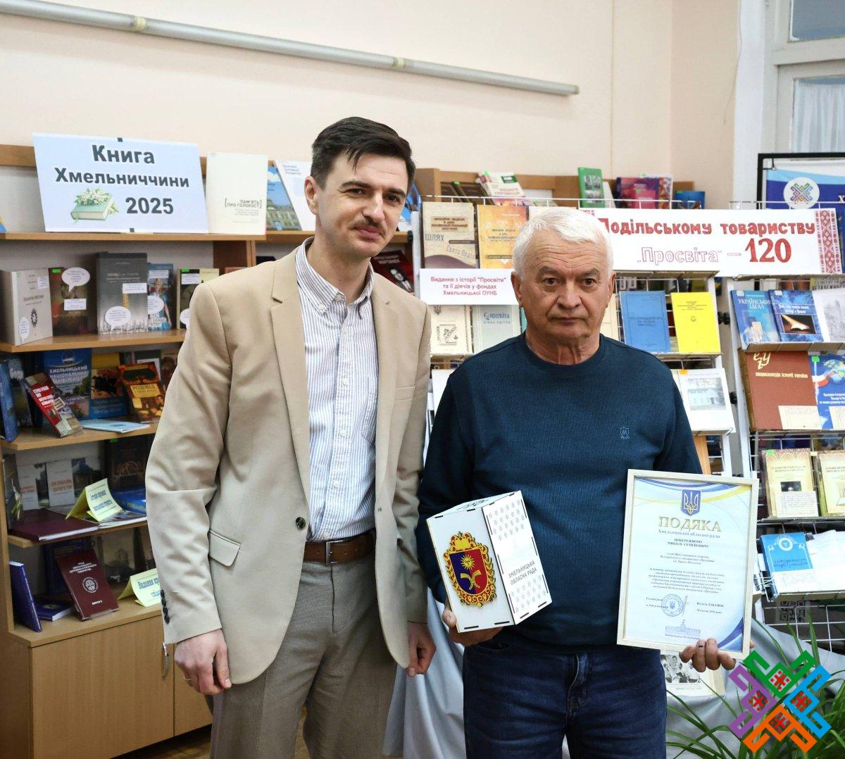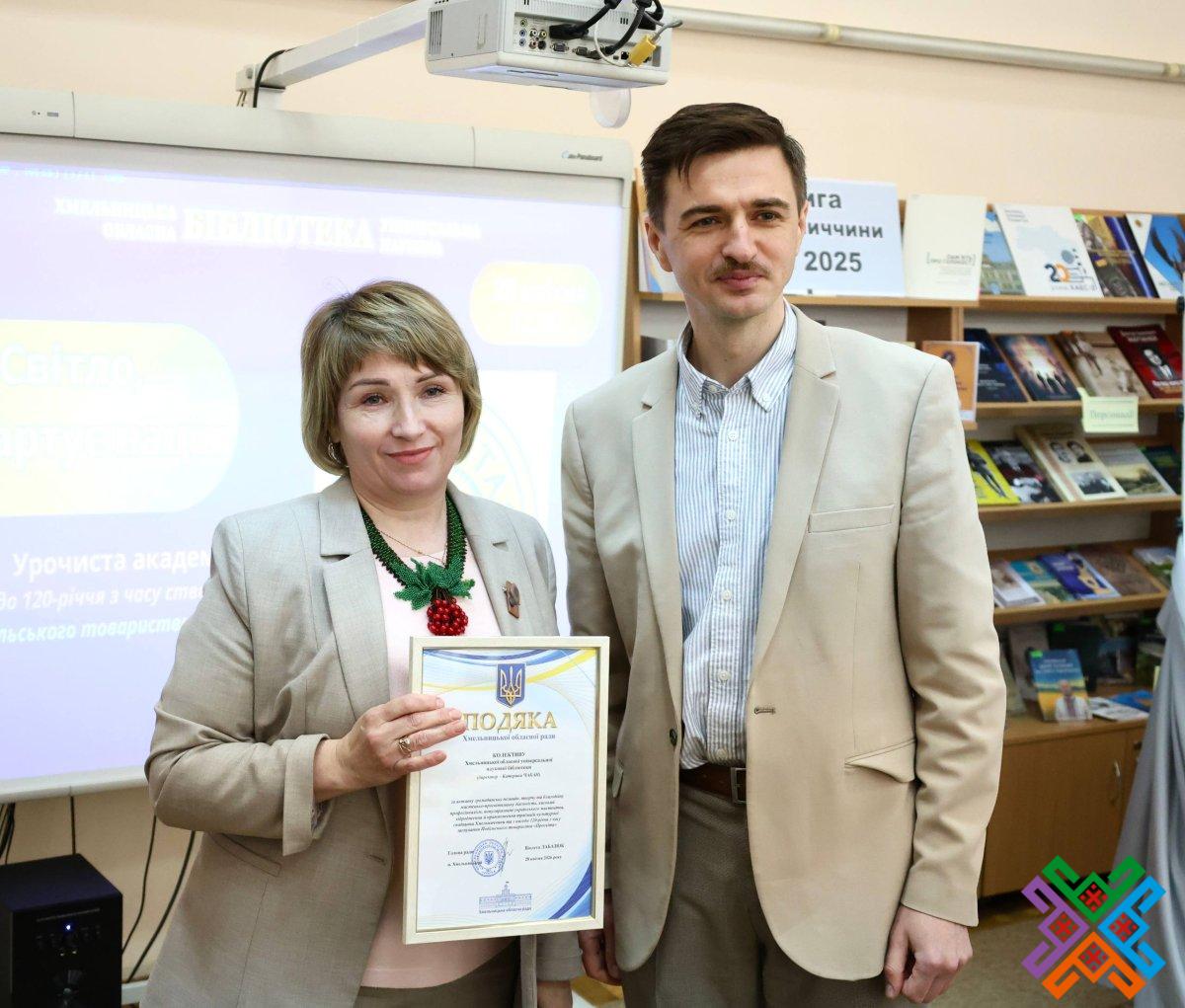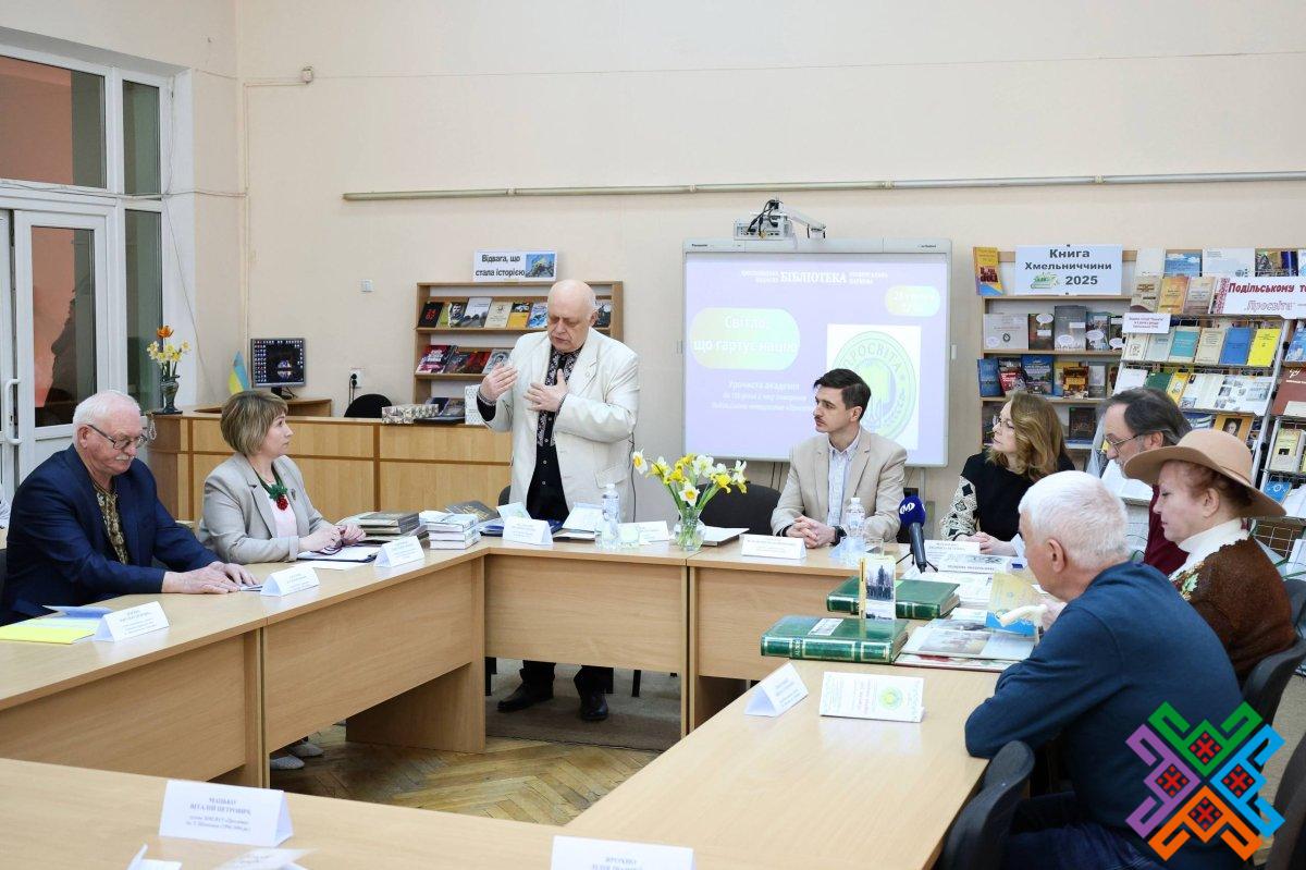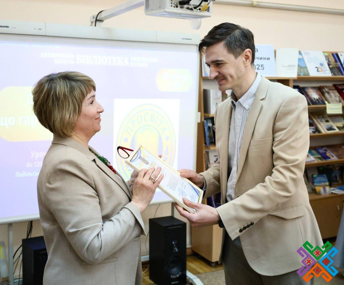 Сьогодні в обласній універсальній науковій бібліотеці відбулася урочиста академія з нагоди 120-річчя створення Подільського товариства “Просвіта”. У зібранні взяли участь перший заступник голови обласної ради Володимир Гончарук, представники обласної військової адміністрації, Хмельницької міської ради, краєзнавці, письменники  та науковці регіону, активісти обласного об’єднання всеукраїнського товариства “Просвіта” імені Т.Г. Шевченка, зокрема, й його колишні очільники. Сьогодні керівником хмельницької “Просвіти” є Віталій Міхалевський – голова Хмельницької обласної організації НСПУ, кандидат фізико-математичних наук, доцент Хмельницького національного університету.
