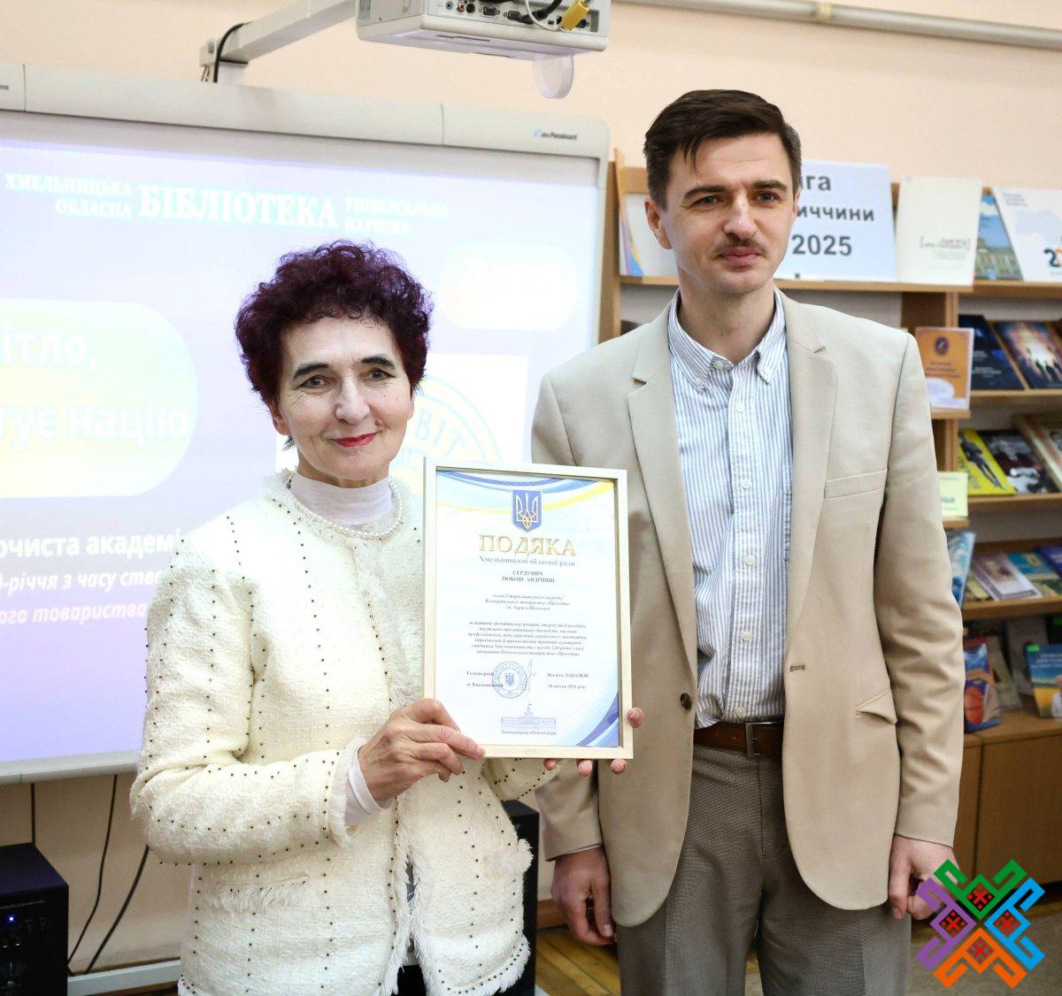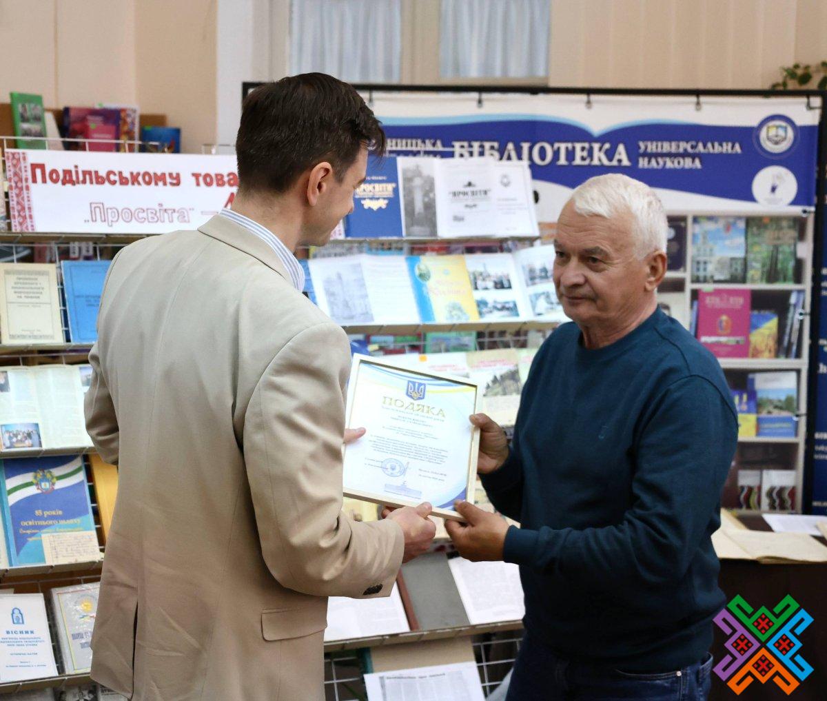 За активну громадянську позицію, творчу та благодійну мистецько-просвітницьку діяльність, високий професіоналізм, популяризацію українського мистецтва, відродження й примноження традицій культурної спадщини Хмельниччини Володимир Гончарук вручив активістам Товариства “Просвіта” Подяки обласної ради та цінні подарунки.