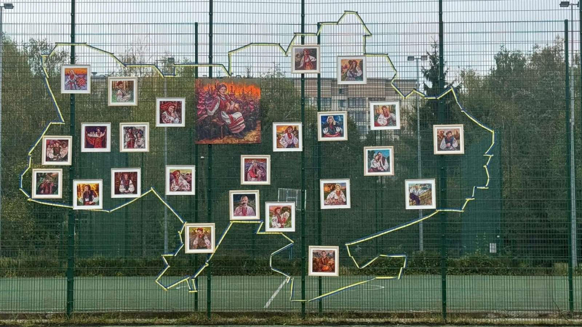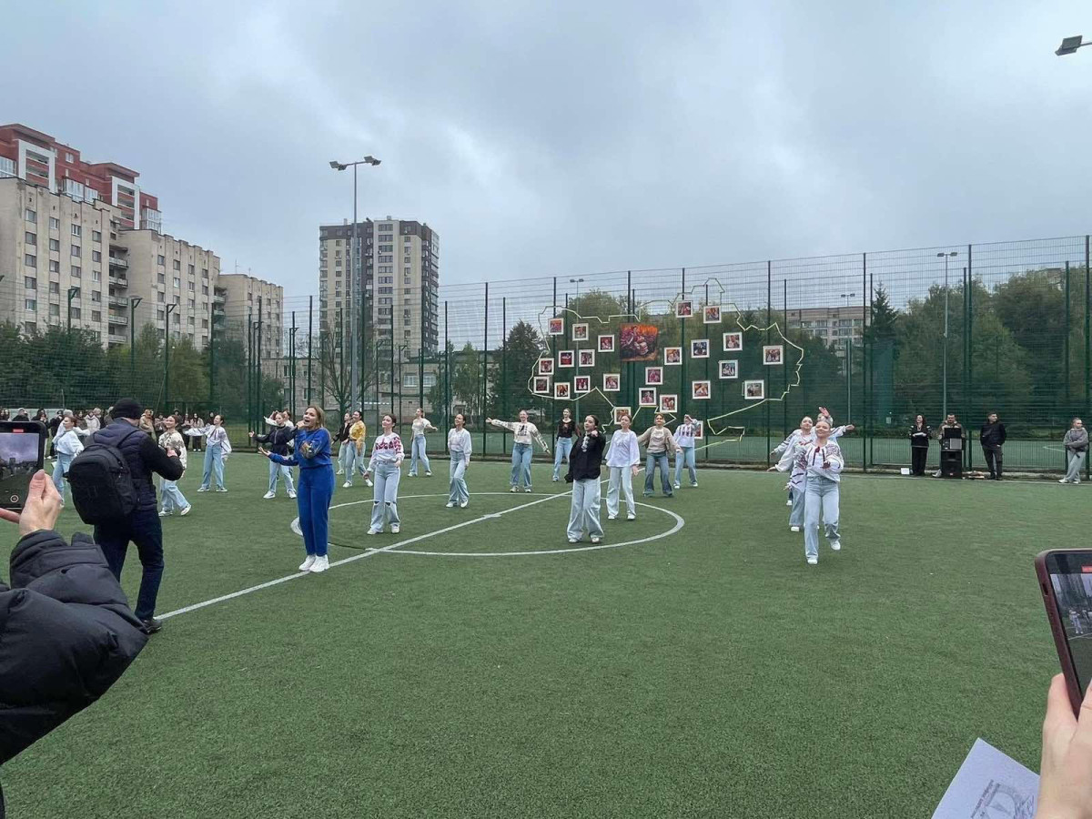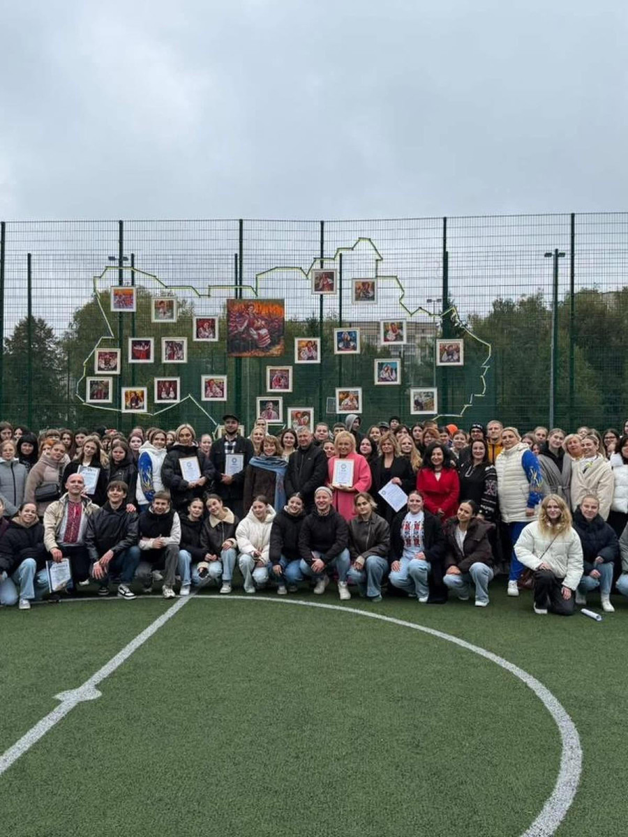 На сітчастій вертикальній основі контурно студенти трьох факультетів один за одним, почергово, позначили та зімкнули границі України, переплітаючи жовто-блакитну стрічку між отворами сітки, створивши таким чином візуал мапи країни.