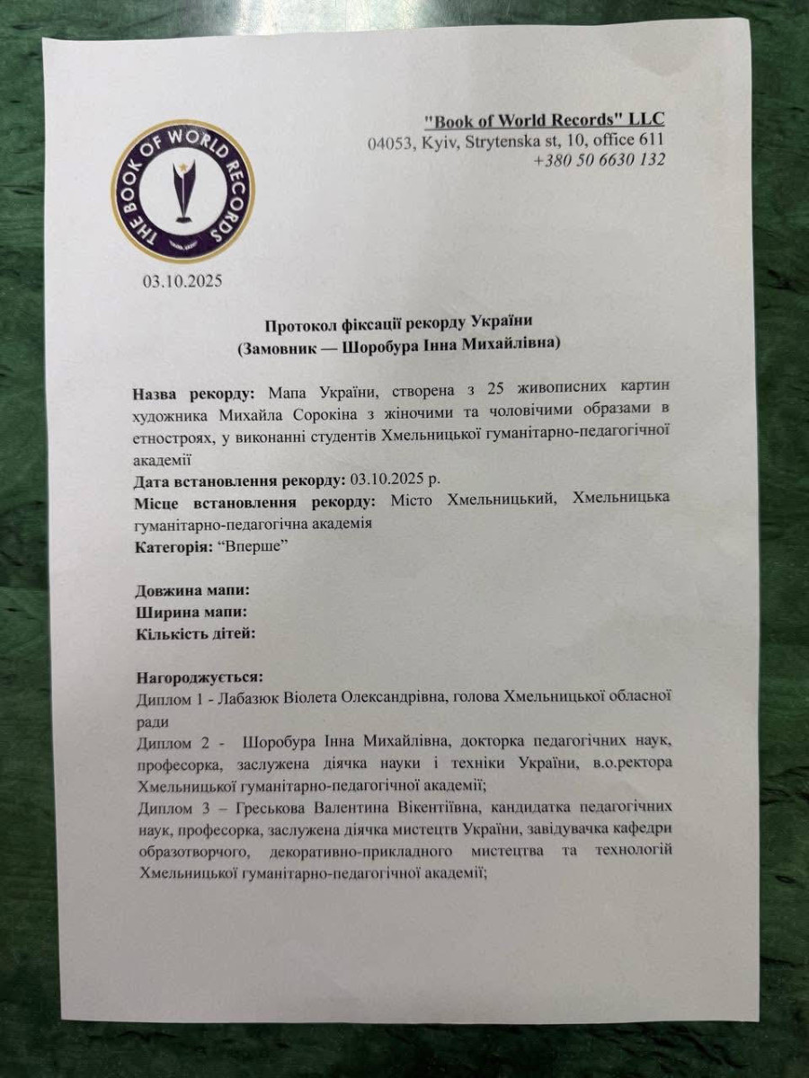 На замовлення ректора, професора Інни Шоробури, за участі офіційної представниці Книги Світових Рекордів у Хмельницькій області Аліни Скоморохової відбулася фіксація рекорду України «Мапа України», створена з 25 живописних картин художника Михайла Сорокіна з жіночими та чоловічими образами в етностроях, за участю 300 студентів Хмельницької гуманітарно-педагогічної академії.