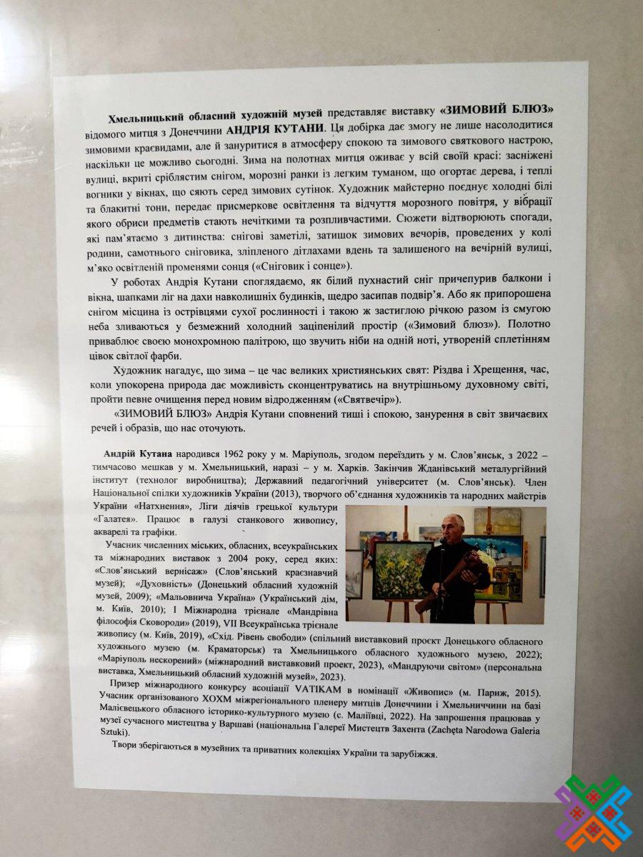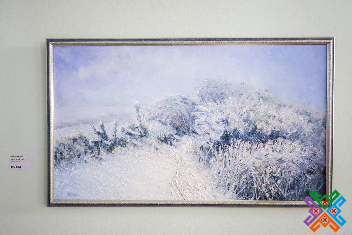Тематичні роботи під назвою «Зимовий блюз» дають змогу зануритися в атмосферу спокою та зимового святкового настрою, наскільки це можливо сьогодні. Художник майстерно поєднує холодні білі та блакитні тони, передає присмеркове освітлення та відчуття морозного повітря. Сюжети відтворюють спогади, які усі памʼятають з дитинства: снігові заметілі, затишок зимових вечорів, проведених у колі родини, самотнього сніговика, зліпленого дітлахами вдень та залишеного на вечірній вулиці, мʼяко освітленій променями сонця.