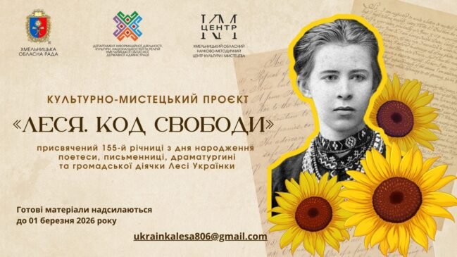 На Хмельниччині реалізується культурно-мистецький проєкт «ЛЕСЯ. КОД СВОБОДИ», присвячений 155-й річниці від дня народження поетеси, драматургині та громадської діячки Лесі Українки.
