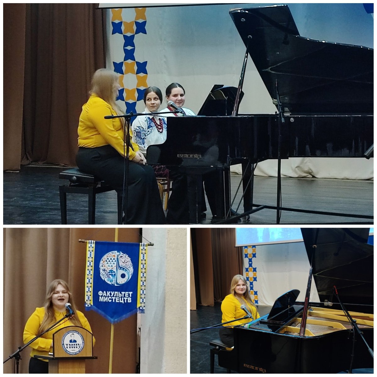 «ФОЛЬКЛОР У ФОРТЕПІАННІЙ ІНТЕРПРЕТАЦІЇ». Під керівництвом доктора філософії (PhD), доцента, доцента кафедри музикознавства, інструментальної підготовки та методики музичної освіти ХГПА Люції Циганюк, Анна Постоловська представила народну мелодику як основу музично-педагогічного мислення у сучасній фортепіанній інтерпретації.