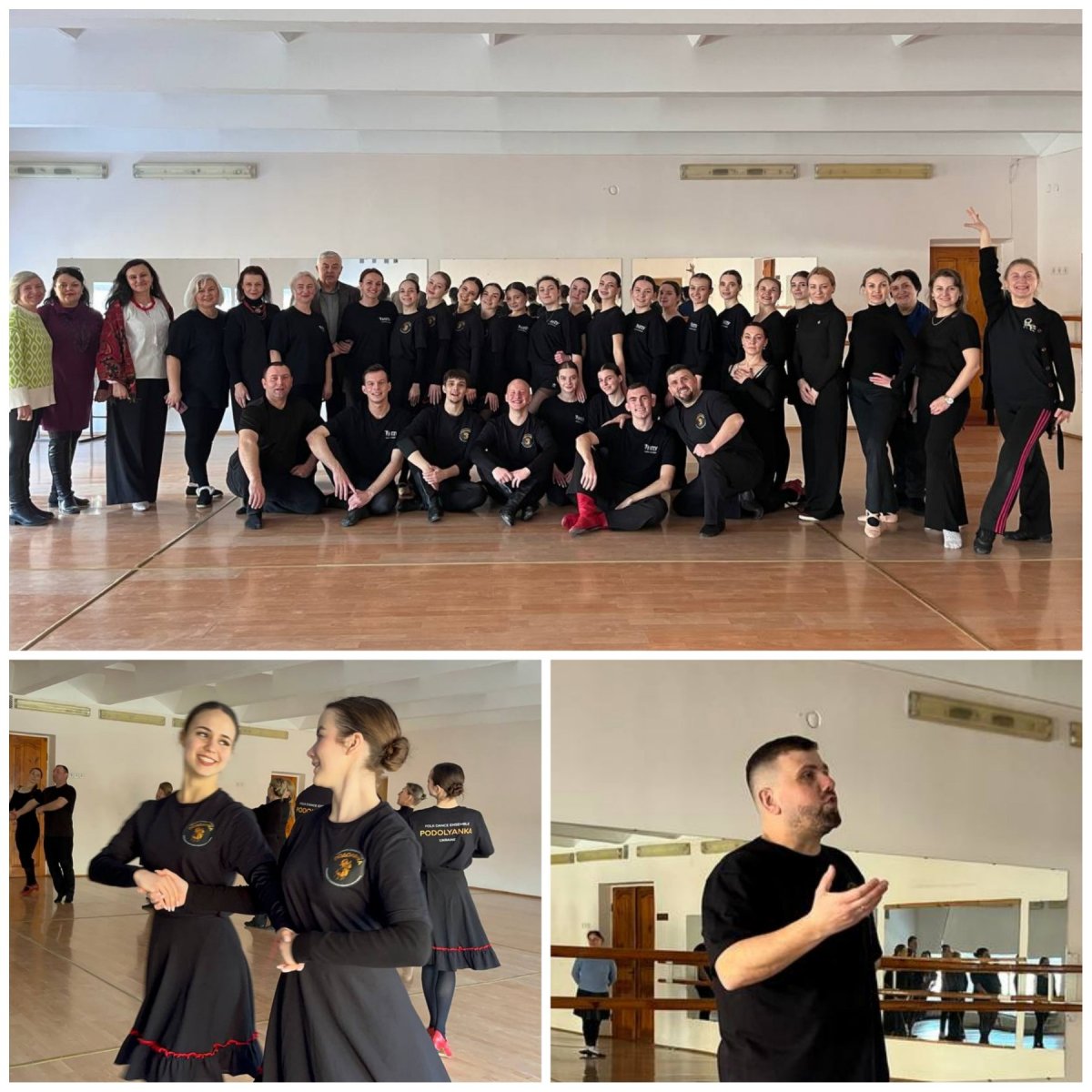 «ФОЛЬКЛОР ЯК СЦЕНІЧНА РЕЖИСУРА». Заслужений артист України, доцент, доцент кафедри хореографії, керівник ансамблю народного танцю «Подолянка» ХГПА, головний балетмейстер Академічного ансамблю пісні і танцю «Козаки Поділля» Сергій Качуринець продемонстрував, як подільський народний танець трансформується у сучасну сценічну мову хореографічного мистецтва.