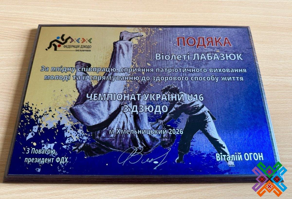 У знак вдячності за плідну співпрацю та сприяння патріотичному вихованню молоді від президента Федерації дзюдо Хмельниччини Віталія Огона голова обласної ради Віолета Лабазюк отримала Подяку.