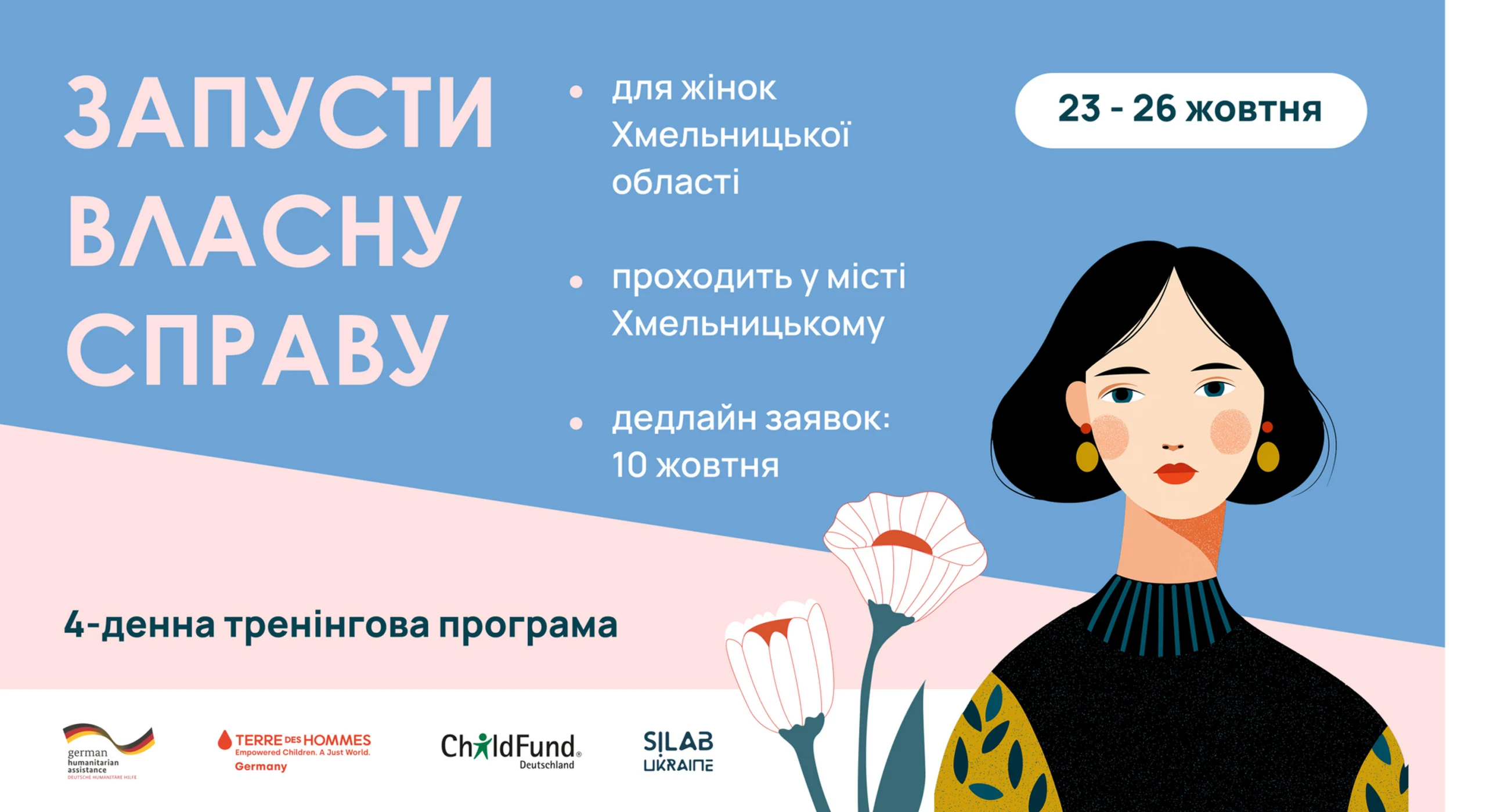 SILab Ukraine за фінансового сприяння Федерального міністерства закордонних справ Німеччини проведуть безоплатний чотириденний тренінг «Запусти власну справу» для жінок Хмельницької області. Ініціатива має на меті надати жінкам, зокрема з числа внутрішньо переміщених осіб, можливість здобути навички та ресурси для старту власної справи або розширення/відновлення бізнесу. Учасниці отримають теоретичні знання й практику від досвідчених менторів. Також передбачена вечірня програма для психологічного розвантаження і рефлексії.