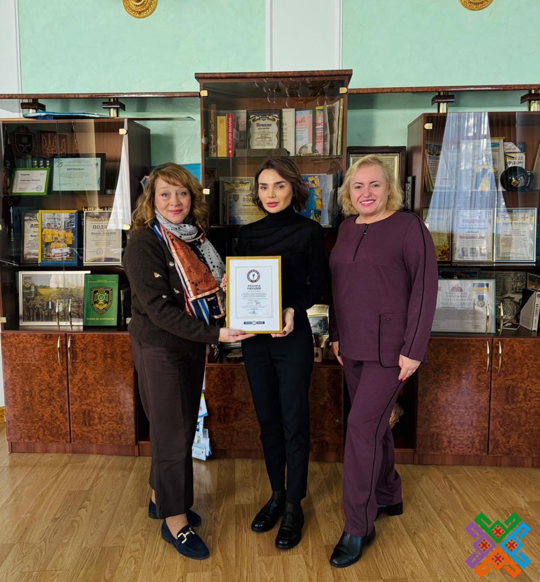 Голова обласної ради Віолета Лабазюк зустрілася з Аліною Скомороховою – офіційною представницею Книги світових рекордів у Хмельницькій області та виконуючою обов’язків ректора, професором, депутатом обласної ради Інною Шоробурою, які передали сертифікат про реєстрацію рекорду України.