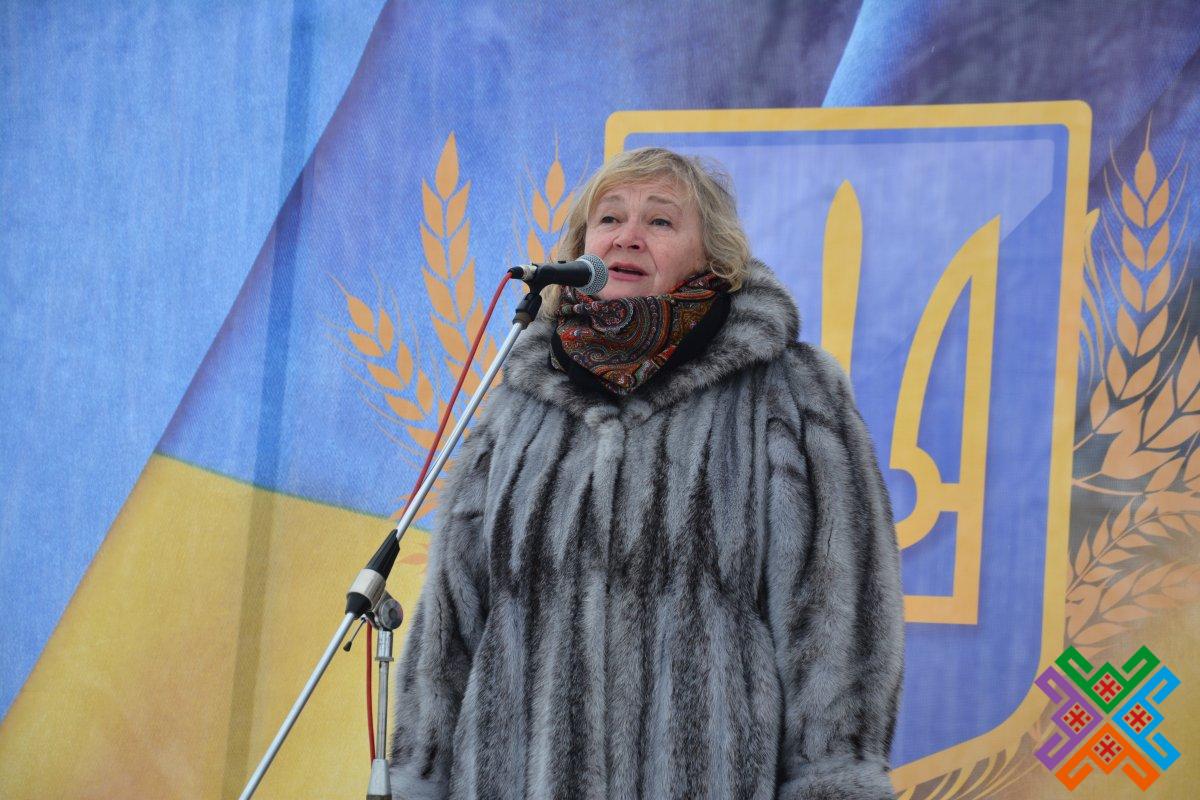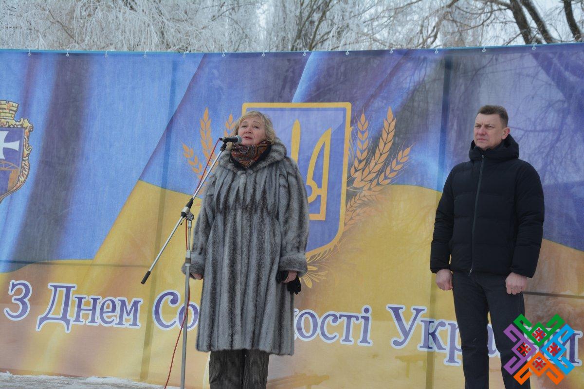 «День Соборності є одним із найвизначніших у нашій історії. Адже українці протягом століть мріяли про незалежну єдину соборну державу і боролися за неї. Сьогодні ми вшановуємо об’єднання в одну державу Української Народної Республіки і Західно-української Народної Республіки, яке було урочисто проголошене 107 років тому в Києві на Софійському майдані. І хоч тоді українцям реалізувати бажаного не вдалося, однак ця подія стала яскравим виявом їх прагнення до національної єдності, – сказала Тетяна Іванівна під час вітального слова, звертаючись до учасників заходу. – Четвертий рік поспіль наша держава переживає надскладні часи, адже українські військові, уся країна знову змушені відстоювати соборність та самостійність України. Тому соборність залишається на порядку денному національних завдань. Цілісна Україна – це повернення окупованих територій. Але всі захоплені міста та села обов’язково будуть звільнені. Україна буде цілісною, бо Соборність – мета Перемоги! Висловлюю слова великої вдячності всім, хто став на захист національних інтересів нашої держави. Вічна пам’ять усім загиблим!».