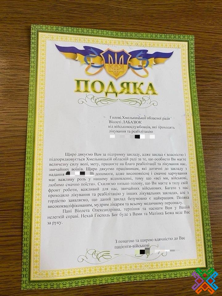 Сьогодні голова обласної ради Віолета Лабазюк зустрілася з військовослужбовцями, які проходять лікування та реабілітацію в одному із закладів охорони здоров’я, що перебуває у обласній комунальній власності. Захисники висловили слова вдячності за підтримку закладу та передали Віолеті Олександрівні Подяку за створення належних умов для лікування та реабілітації захисників після виконання бойових завдань.