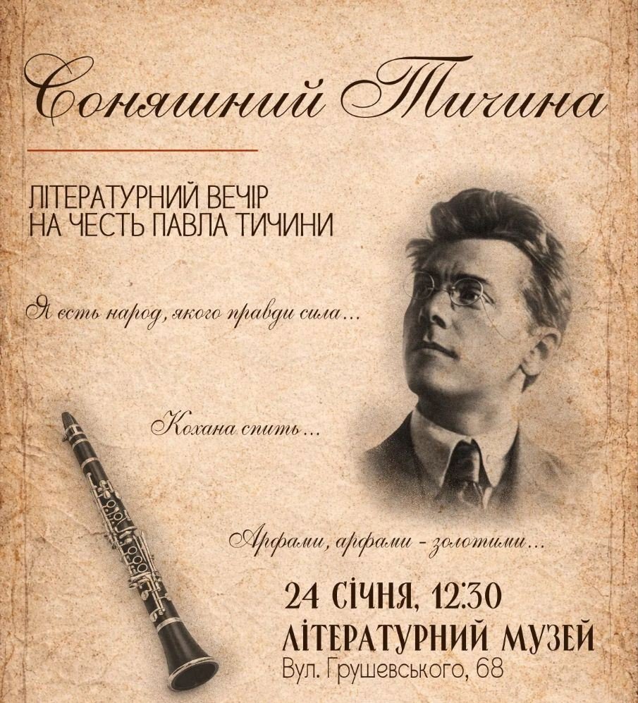 Хмельницький обласний літературний музей та творча молодь Хмельницького запрошує мешканців міста на літературний захід памʼяті Павла Тичини – «Соняшний Тичина».
