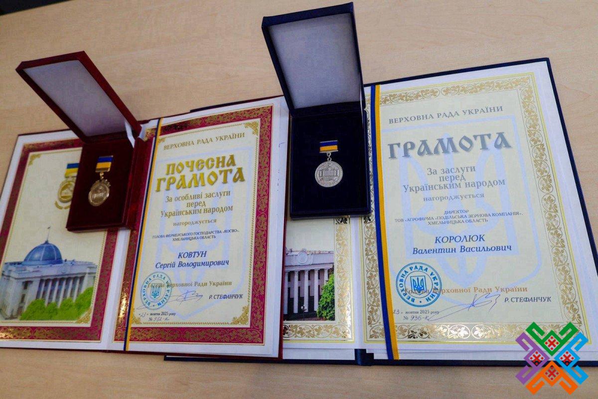 Також за розпорядженням Голови Верховної Ради України Руслана Стефанчука за вагомий особистий внесок у соціально-економічний розвиток регіону, сумлінну працю, високий професіоналізм, активну громадську та волонтерську діяльність Віолета Лабазюк вручила Почесну Грамоту Верховної Ради України голові фермерського господарства “Косво” Сергію Ковтуну та Грамоту Верховної Ради України директору товариства з обмеженою відповідальністю “Агрофірма “Подільська зернова компанія” Валентину Королюку.