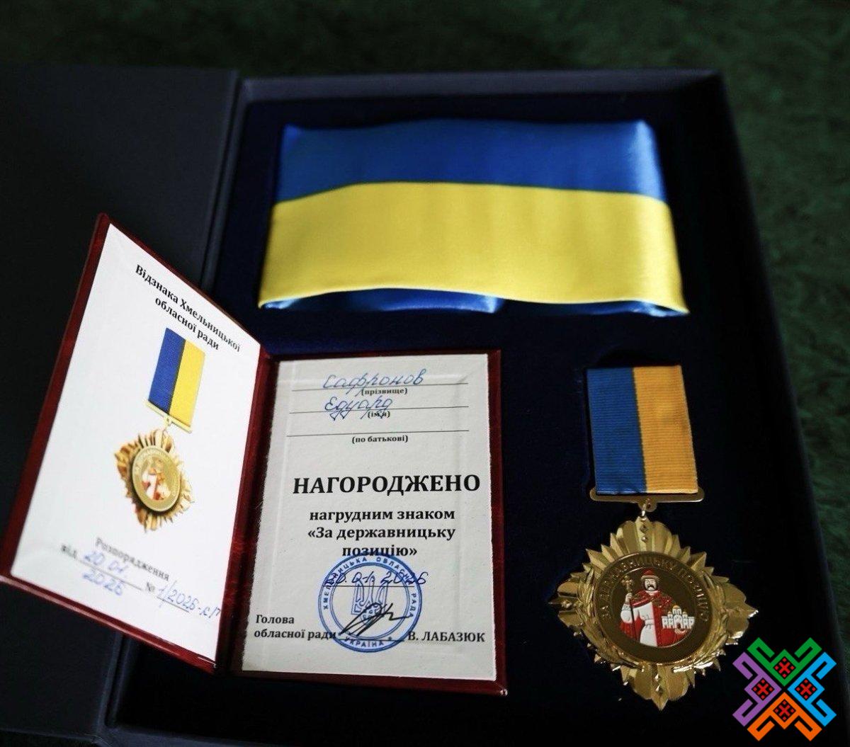 Днями у рамках проведення засідання Консультативної ради з питань сприяння захисту прав та інтересів військових і ветеранів збройних конфліктів, їхніх сімей, а також родин загиблих Героїв російсько-української війни, що діє при Хмельницькій обласній раді, голова обласної ради Віолета Лабазюк відзначила нагрудним знаком «За державницьку позицію» та привітала з 50-річчям ветерана, члена Консультативної ради Едуарда Сафронова.