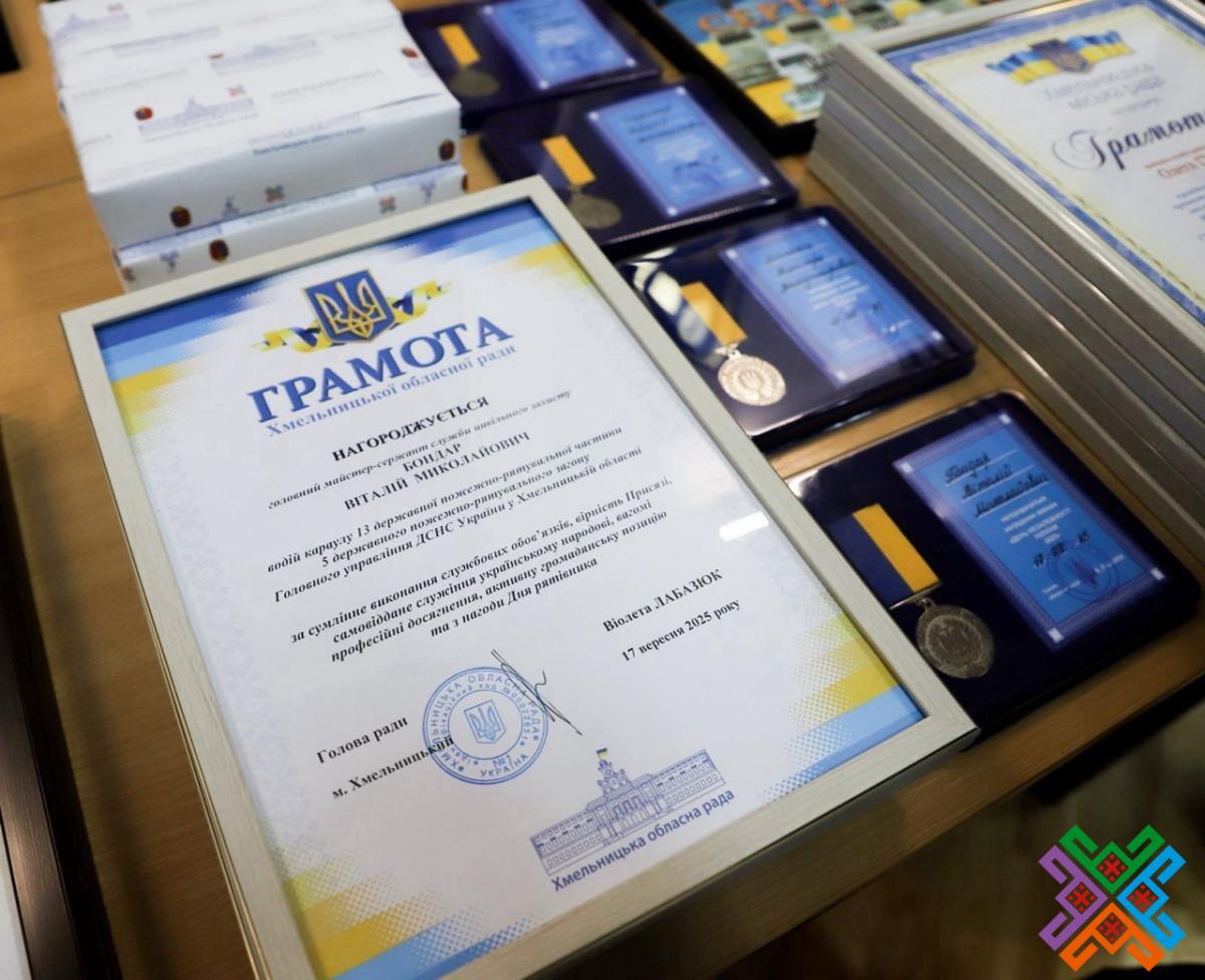 За сумлінне виконання службових обов’язків, вірність Присязі, самовіддане служіння українському народові, вагомі професійні досягнення, активну громадянську позицію та з нагоди Дня рятівника Віолета Лабазюк відзначила працівників ДСНС Грамотами обласної ради та нагрудними знаками “День Незалежності 2025”.