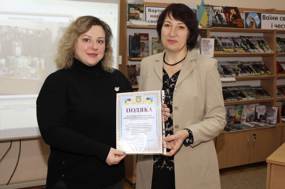 Цьогоріч працівники книгозбірні передали 100 українських книг воїнам у військові частини, ветеранські простори та Хмельницький гарнізонний будинок офіцерів. Бібліотекарі вірять, що українська книга здатна підтримати бойовий дух і патріотичні настрої наших воїнів.