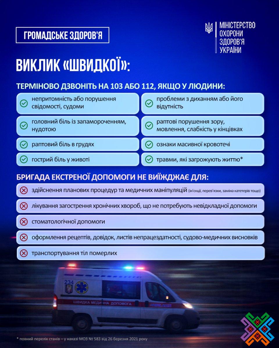 Підстави, за яких бригада екстреної медичної допомоги виїздить на виклик, визначені наказом МОЗ № 583 від 26 березня 2021 року: https://tinyurl.com/y2vtnze8.