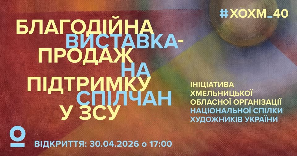 30 квітня Хмельницький обласний художній музей запрошує на відкриття благодійної виставки-продажу на підтримку спілчан у Збройних силах України. Виставка створена за ініціативи Хмельницької обласної організації Національної спілки художників України.