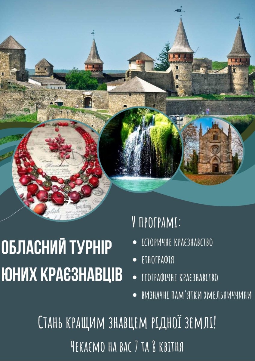 Хмельницький обласний центр туризму, краєзнавства та екологічного виховання учнівської молоді запрошує найдопитливіших та найактивніших до участі в обласному турнірі юних краєзнавців. Це інтелектуальне змагання для тих, хто захоплюється минулим та сучасним Хмельниччини.