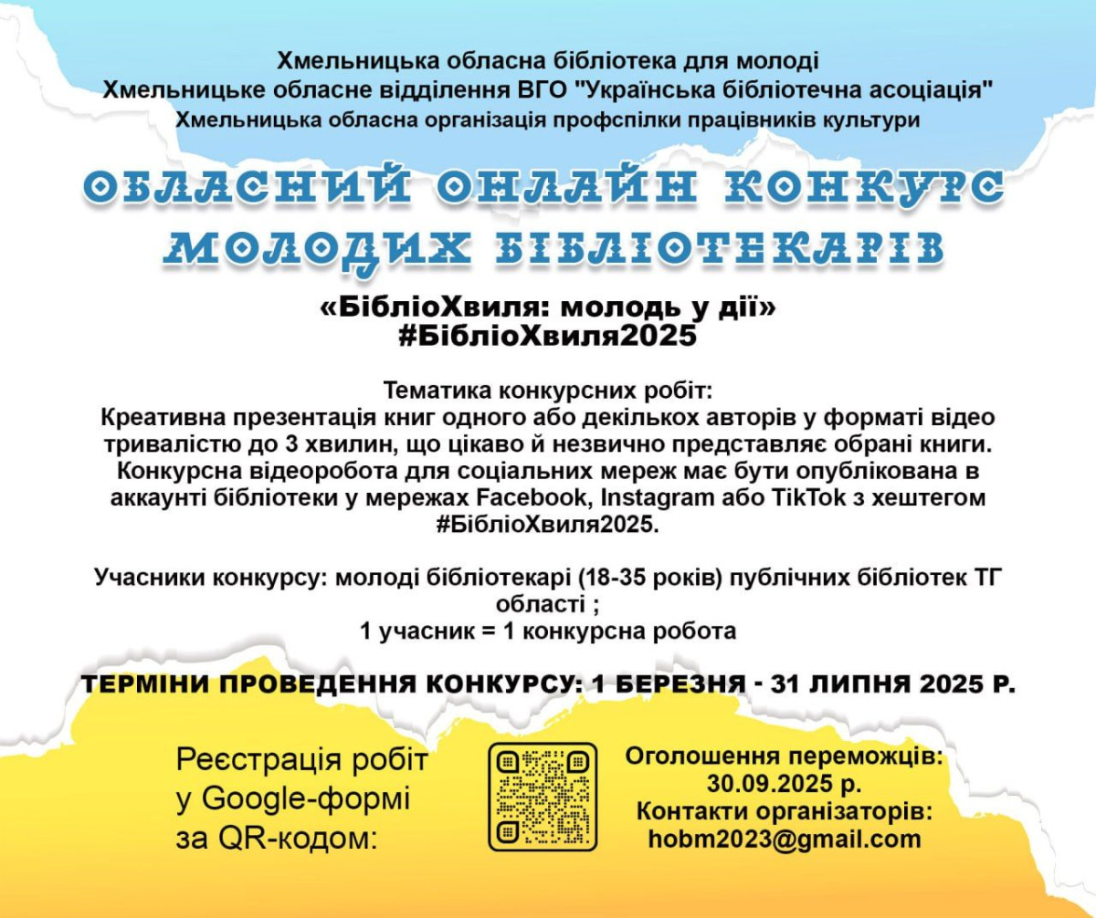 Врученням нагород та подарунків завершився конкурс молодих бібліотекарів Хмельниччини «БібліоХвиля: молодь у дії», який проводився   Хмельницькою обласною бібліотекою для молоді у партнерстві з Хмельницьким обласним відділенням ВГО Українська бібліотечна асоціація та Хмельницькою обласною організацією профспілки працівників культури.
