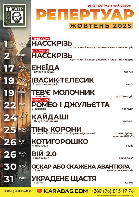 Хмельницький обласний академічний музично-драматичний театр імені Михайла Старицького запрошує усіх охочих відвідати вистави, які зігрівають серце, пробуджують думки і дарують емоції.